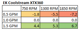 Effectively these show percentage gains relative to a reference point. It’s an interesting way to show gains/losses while changing a variable. This first table shows performance gain or loss relative to 1.0GPM flow rate: