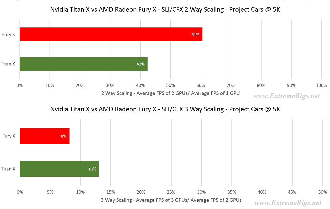 Project Cars is very playable on a single Titan X clocking in an average of 59 FPS. The Fury X however is considerably lower at 37FPS and requires a second card to bring it up to 61FPS. While Nvidia’s frame rate continues to increase as more cards are added, AMD’s scaling is far poorer than their usual performance: