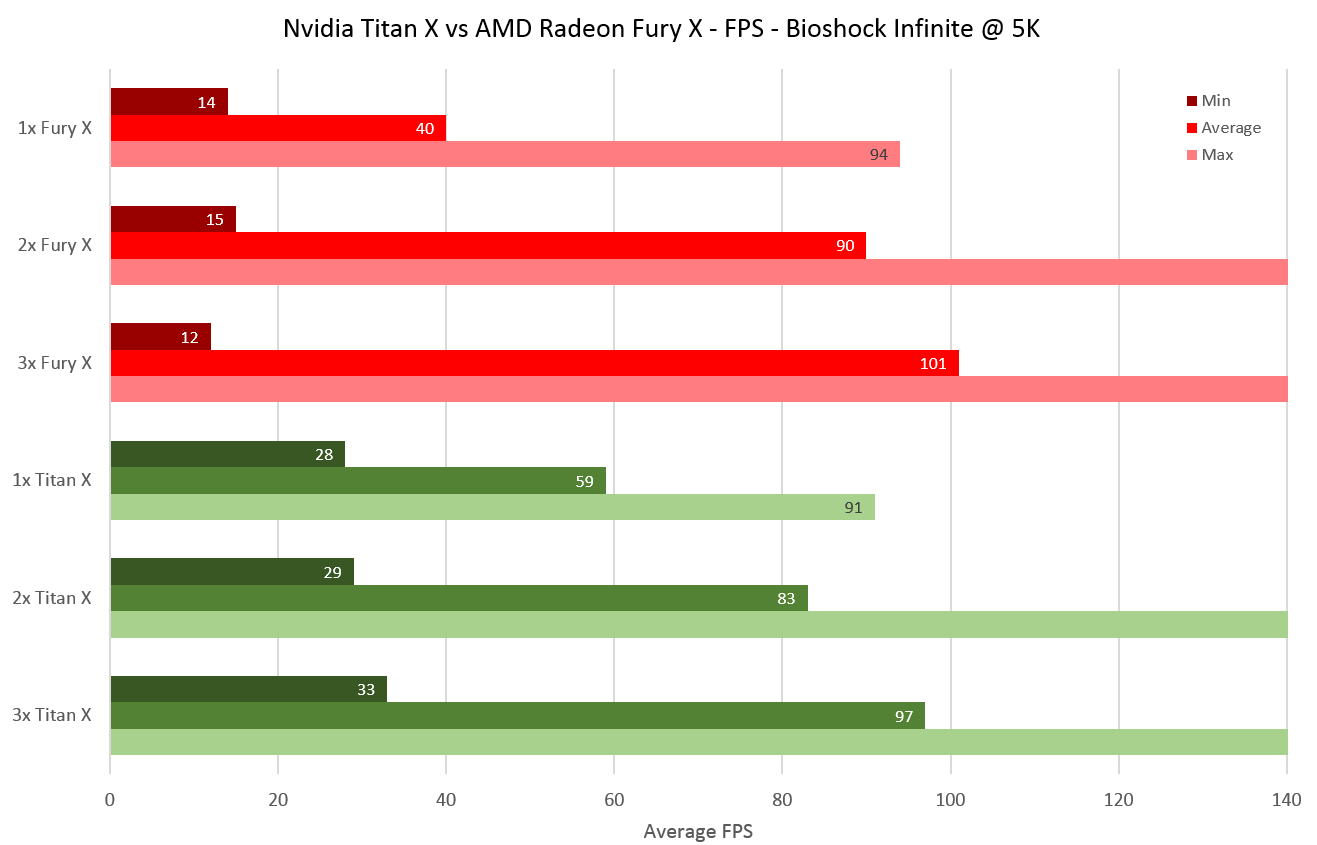 So for Bioshock Infinite – the edge goes to the Titan X as a single GPU is enough to power it, while maintaining a sizeable lead over AMD in that particular case.