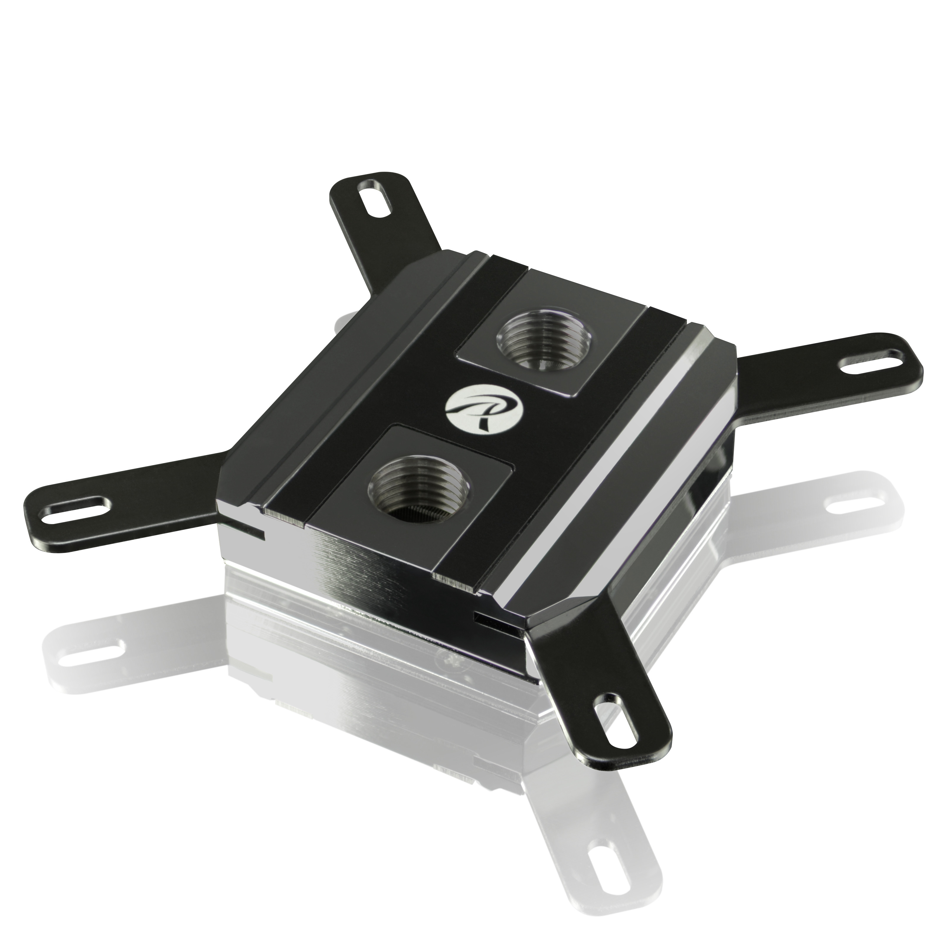 The reservoir has built in LEDs as well as 5 ports on the bottom and 3 ports on the top. One of those top ports is oversized 3/8 for easier filling which is quite unusual for EK. Normally we see that only from XSPC. There are two optional mounts free standing as above and what I like to call the bicycle waterbottle holder for mounting to a chassis: